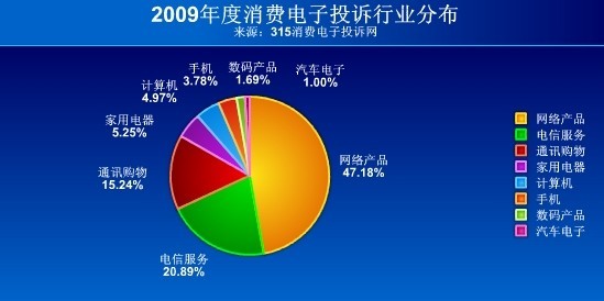 中新網(wǎng)3月12日電 中國電子商會頒布《2009年度消費(fèi)電子產(chǎn)業(yè)售后服務(wù)藍(lán)皮書》(下稱“藍(lán)皮書”):《藍(lán)皮書》顯示:2009年,網(wǎng)絡(luò)產(chǎn)品以105438宗投訴居榜首位置,占據(jù)消費(fèi)電子投訴的半壁江山,所占比例高達(dá)47.18%。排在二、三位的行業(yè)分別是電信服務(wù)和通訊購物,這三大行業(yè)的投訴量占了消費(fèi)電子投訴量的八成以上。