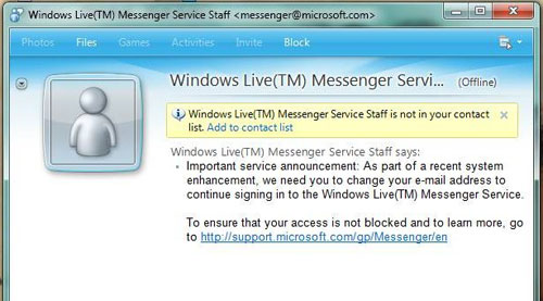 這個聲明稱,作為最近系統(tǒng)升級的一部分,我們需要你們修改你們的電子郵件地址以便繼續(xù)登錄Windows Live Messenger服務(wù)。為了保證你的訪問不被封鎖和了解更多的內(nèi)容,請訪問微軟技術(shù)支持網(wǎng)站/gp/Messenger/en。