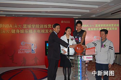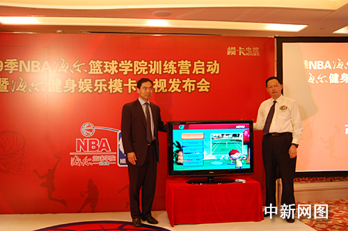 秉承NBA的體育及娛樂精神,在此次啟動儀式上,作為NBA官方指定使用電視產(chǎn)品——海爾彩電推出了健身娛樂?娨,并發(fā)布了“云媒體”戰(zhàn)略。海爾集團信息產(chǎn)品本部總工程師翟翌立博士介紹,海爾推出“健身娛樂?ā彪娨曋荚谧尭嗟娜俗悴怀鰬艟涂梢钥鞓方∩聿Ⅲw會NBA精神。同時,隨著網(wǎng)絡時代的來臨,針對不同使用習慣用戶的需求,海爾彩電推出了“搜狐在線網(wǎng)絡模卡”和“迅雷下載網(wǎng)絡?ā保沟萌藗兛梢栽诩彝ㄟ^電視一鍵上網(wǎng)看高清大片,還將聯(lián)合更多的網(wǎng)絡內(nèi)容提供商,讓用戶無需擔心個人儲存設備空間的限制,可以隨時、無限量地自由選擇自己所需要的網(wǎng)絡內(nèi)容資源。