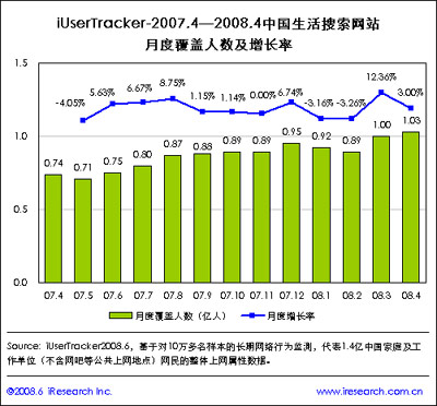 近日,艾瑞咨詢發(fā)布國內(nèi)首部《中國生活搜索行業(yè)市場研究報告》。報告顯示,截至2008年4月,國內(nèi)生活搜索覆蓋人群已經(jīng)超過1.03億,較去年同期增幅39%,超過網(wǎng)絡游戲用戶數(shù)量5700萬,已經(jīng)成為中國網(wǎng)民上網(wǎng)的主流應用。