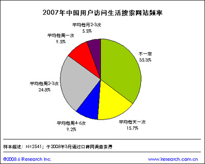 國家工業(yè)和信息化部公布的信息顯示,截至08年2月份,我國網(wǎng)民數(shù)達2.21億人,超過美國居全球首位。而截至2008年4月,國內(nèi)生活搜索覆蓋人群已經(jīng)超過1.03億,較去年同期增幅39%。在口碑網(wǎng)上完成的對網(wǎng)民調(diào)查顯示,約有59.2%的用戶每周至少訪問一次生活搜索網(wǎng)站,查找生活服務商家的信息或發(fā)布相關生活服務需求,其中將近24.9%的用戶幾乎每天都會訪問生活搜索網(wǎng)站,僅有不到4成的用戶沒有確定的訪問習慣。報告認為,正是基于用戶對于本地生活信息的需求促使生活搜索網(wǎng)站的出現(xiàn)。從目前訪問次數(shù)看,生活搜索網(wǎng)站已成為眾多網(wǎng)民日常生活比較依賴的工具之一。