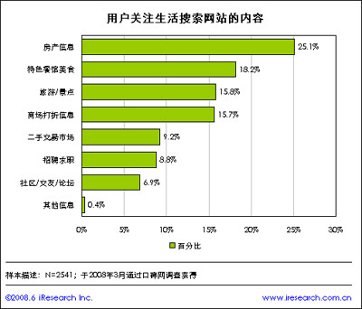 調(diào)查數(shù)據(jù)顯示,用戶感興趣的生活服務信息集中在四大類,其中美食占18.20%,旅游占15.83%,商家打折15.66%,房產(chǎn)25.09%,在房產(chǎn)信息中,出售房屋信息關注度最高,占到總整的6.4%,相對而言,其它類似家政、交友、招聘信息關注的程度較小。