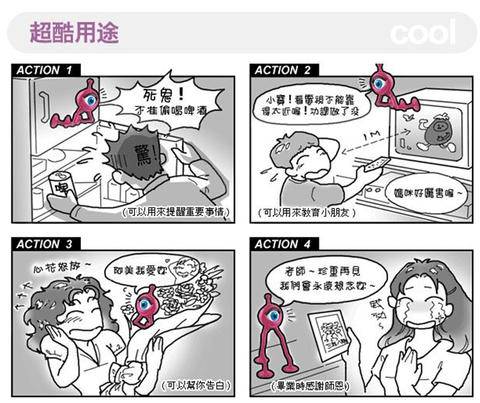 大大的眼睛、有三條帶吸盤的柔韌長腳,一幅外星人的模樣。初次見它可能會認(rèn)為這不過是個造型有點另類的玩偶,其實它是個用途多多的留言機,兩個人之間浪漫的貼心的交流……靠它轉(zhuǎn)達別有一番樂趣。