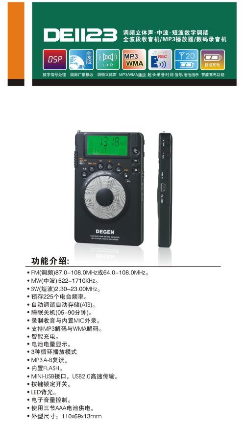 此外,德勁公司近期還推出了另一款超薄數(shù)字調(diào)諧收音機DE1123。該機內(nèi)嵌MP3,集全波段數(shù)碼收音、數(shù)碼錄音、MP3播放多功能于一體,收錄放自如;而其外型尺寸只有110*69*13mm,小巧玲瓏,方便攜帶。DE1123不僅功能強勁,外型小巧超薄,而且塑料外殼手感非常好,按鈕靈活,非常人性化。FM調(diào)頻范圍在87.00-108.00MHz或64.00-108.00之間可以互相轉(zhuǎn)換收聽,非常適合校園學(xué)生一族,F(xiàn)M\MW\SW可一鍵切換,SW快速米波段轉(zhuǎn)換,彌補了沒有數(shù)字鍵的遺憾。據(jù)了解,該機在傳統(tǒng)收音機的基礎(chǔ)之上嵌入數(shù)碼元素,創(chuàng)新技術(shù)在國內(nèi)行業(yè)尚屬首創(chuàng)。