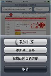 ⑹網(wǎng)頁管理界面主要包括“添加書簽”、“添加制主屏幕”和“郵寄此網(wǎng)頁的鏈接”三個選擇。選擇“添加書簽”按鈕,可將該網(wǎng)頁的網(wǎng)址加到書簽列表中;選擇“添加制主屏幕”按鈕,可形成屏幕快捷鍵;選擇“郵寄此網(wǎng)頁的鏈接”可將該網(wǎng)頁的網(wǎng)址發(fā)送給別人。