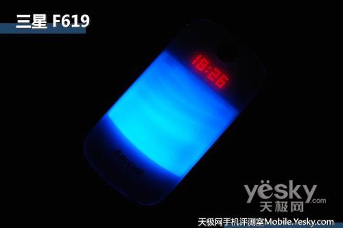 三星F619手機(jī)機(jī)身正面加蓋了水晶殼,在其下隱藏著七彩瀑布燈與LED數(shù)字燈光(在手機(jī)設(shè)置中,LED數(shù)字燈光被稱(chēng)之為魔力亮點(diǎn)),在來(lái)電、短信或者播放音樂(lè)時(shí),外部瀑布燈都會(huì)有相應(yīng)的事件啟動(dòng)。