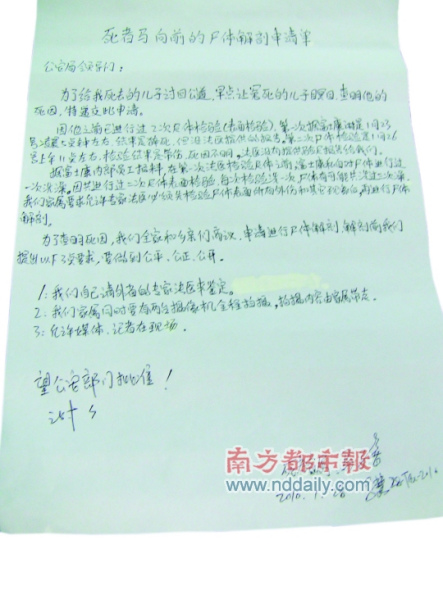馬向前家屬向警方提交關(guān)于馬向前尸體解剖的申請(qǐng)書,其中提到的現(xiàn)場(chǎng)見(jiàn)證網(wǎng)友(見(jiàn)紅框部分)正是富士康報(bào)警尋找的那個(gè)人。
