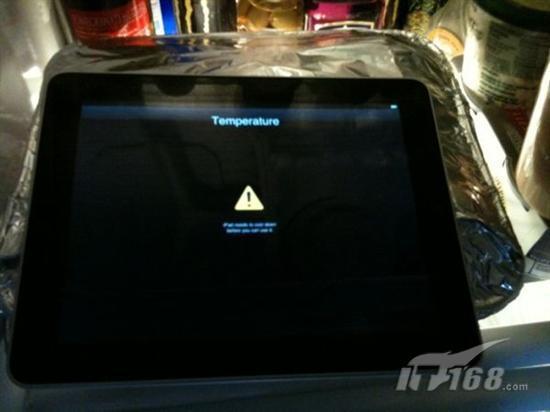 引自:“PC Magazine編輯Zach Honig在twtter” 他帶著他全新的iPad在紐約市出外曬太陽(前幾天紐約市的氣溫都超過攝氏20度左右),十分鐘后iPad就出現(xiàn)了“iPad需要降溫后才能使用”的信號然后關(guān)機。Honig把他的iPad放進冰箱中,然后幾分鐘后iPad就回復(fù)正常了。