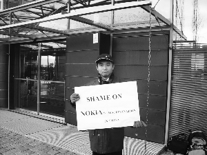 芬蘭時(shí)間11月21日上午12點(diǎn),反乙肝歧視的維權(quán)人士陸軍抵達(dá)芬蘭諾基亞公司總部,舉牌抗議諾基亞?wèn)|莞公司在乙肝歧視訴訟中有撒謊行為。
