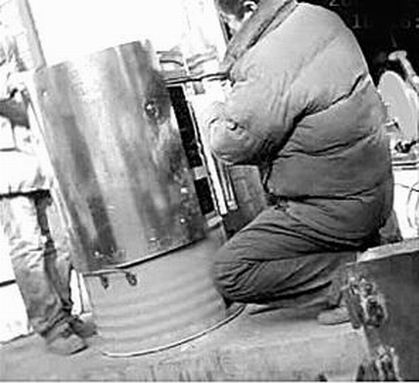 昨天(12月24日),記者來(lái)到天橋區(qū)臧家屯小區(qū)附近,一條街旁有幾家加工鐵爐子的業(yè)戶,其中一家業(yè)戶前擺著一些大鐵桶,業(yè)戶在一個(gè)藍(lán)色的大鐵桶前忙活著。記者走近一看,業(yè)戶在加工地瓜烤爐,他給藍(lán)色的大鐵桶包上半米高的白色鐵皮!澳氵@里加工地瓜烤爐嗎?多少錢一個(gè)?”記者問。“300多元一個(gè)!睒I(yè)戶指著正在加工的大鐵桶說,“這個(gè)烤爐已經(jīng)有人買了,你如果想要烤爐,先挑個(gè)鐵桶吧!
