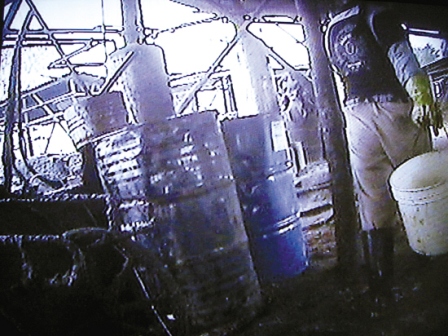 昨天下午,羊城晚報記者以收購“潲水油”為名,進入該家煉油窩點。從泰龍工業(yè)園附近的一條小路拐入,穿過鐵路涵洞不到100米即到,門口以竹柵欄做門,未見廠名或掛任何招牌,卻用木桿高高掛起一個油桶。人一走近門口,一陣難聞的餿臭味便迎面撲來,入門左側(cè)堆放了幾十個空油桶,還有一堆堆榨剩的油渣。場內(nèi)中央并排連著十幾個大水泥池,池內(nèi)裝填有大量剩飯剩菜等食品垃圾,空氣里彌漫著惡臭,令人掩鼻;再往里走,是一架帶有發(fā)動機的簡陋榨油機,機器轟鳴聲中,不斷有深黃色的油液被擠出,滴到榨油機下方的一個槽里;旁邊還有幾個貌似用作煮油的圓筒裝置,周圍油污滿地。記者現(xiàn)場看到,場內(nèi)沒有一間固定建筑,全是用木頭、鎂瓦搭建起來的粗陋臨時棚寮。