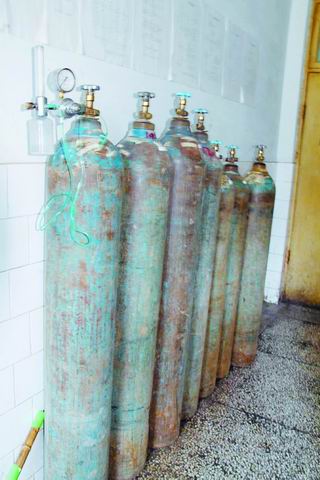 尉氏縣一些群眾向記者反映,尉氏縣第二人民醫(yī)院繼續(xù)使用工業(yè)氧冒充醫(yī)用氧。昨天上午,記者來到該院病房樓一樓內科住院部,在一個標注有搶救室的房間里,放著7個氧氣鋼瓶,沒有醫(yī)用氧氣合格證、沒有藥品批準文號、沒有生產日期,甚至鋼瓶上沒有氧氣生產廠家的名字。有的鋼瓶上的檢驗標志注明使用時間為2004年至2007年。一個鋼瓶上還裝著吸入器,病房內的患者告訴記者,患者吸的就是鋼瓶內的氧氣。