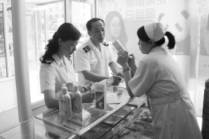 昨日10時(shí)許,記者與朝陽(yáng)區(qū)衛(wèi)生局衛(wèi)生監(jiān)督所的執(zhí)法人員來(lái)到位于南湖大路一工地附近的瑞豐大藥房,這是一間規(guī)模較小的藥房,但藥房里擺放的藥品種類(lèi)卻不少,據(jù)藥房?jī)?nèi)的售藥人員介紹,店里的消毒藥主要賣(mài)給附近的農(nóng)民工。