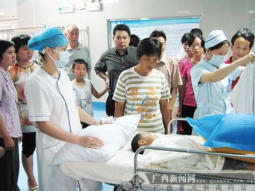 6月23日下午2時(shí),記者趕到貴港市人民醫(yī)院時(shí),正遇見自治區(qū)衛(wèi)生廳、教育廳的領(lǐng)導(dǎo)前來看望中毒的幼兒。在醫(yī)院外科樓二樓的重癥監(jiān)護(hù)室內(nèi),5名幼兒正在接受救治,其中3名病情較重。一名看起來只有四五歲的小孩口鼻插著導(dǎo)管,躺在床上不停地抽搐。醫(yī)生告訴記者,這名幼兒身體素質(zhì)較差,被送到醫(yī)院搶救后出現(xiàn)了血尿、高燒、肺水腫等癥狀,有病情加重的趨勢。后來,經(jīng)過搶救,病情得到緩解。
