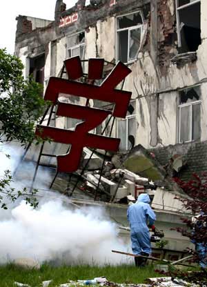 5月18日,防疫人員在映秀鎮(zhèn)一處學校的廢墟上噴灑消毒水。