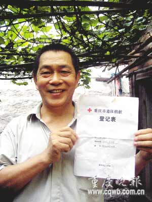 蔣必忠的愿望在7月24日這天變成了現(xiàn)實(shí)。那天下午,當(dāng)他躺在病床上,用顫抖的右手在那張《重慶市遺體捐獻(xiàn)登記表》上歪歪斜斜簽下自己的名字后,他長長地舒了口氣。就這樣,這個(gè)59歲的直腸癌晚期患者,成為在北碚區(qū)紅十字會(huì)登記的首個(gè)農(nóng)民遺體捐獻(xiàn)者。