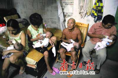 記者隨即前往夏成富的住處了解情況。在一間只有10多平方米的出租屋里,擺著一張雙人床,小夏夫妻和年邁的父母、4個(gè)孩子就生活在這個(gè)狹小的空間里。4個(gè)小寶寶分別被爸爸媽媽和爺爺奶奶抱著喂奶。