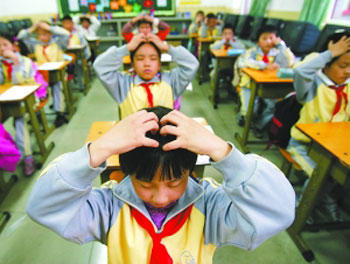 十一長假過后,西四北四條小學(xué)的學(xué)生就開始學(xué)做新版眼保健操了。多數(shù)老師都認為新版眼保健操動作簡單易學(xué),而且增加了腳趾活動和按壓頭部的內(nèi)容,比過去有不少進步。但新操中“腳趾抓地”這樣的隱蔽動作,不會脫了鞋檢查,不容易監(jiān)督。