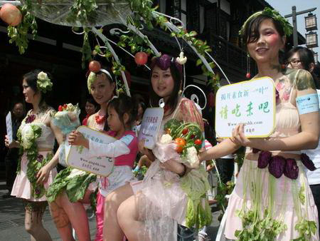 當(dāng)天正值第四十個(gè)世界地球日,成都文殊坊街上人流熙攘。這幫身披菜葉的年輕漂亮女子馬上就成為行人注目的焦點(diǎn),“喲,遠(yuǎn)看就只掛了些菜葉子在身上,原來還是穿了點(diǎn)紗的嘛,是不是又在搞什么商業(yè)活動(dòng)哦?”四川新聞網(wǎng)記者在現(xiàn)場(chǎng)看到,雖然沒怎么搞清楚狀況,但不少市民已經(jīng)掏出手機(jī)來開始拍照。得知是群素食主義者的宣傳活動(dòng)后不少市民都打趣稱,“用穿得少的美女上街當(dāng)噱頭,肯定要轟動(dòng)。”