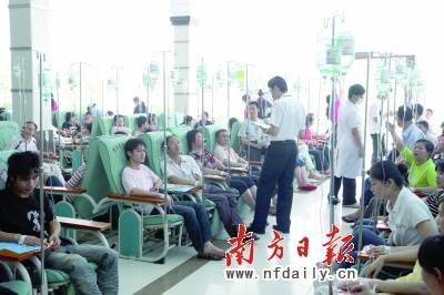 昨天上午11時許,記者趕到樟木頭醫(yī)院時,該院的輸液大廳坐滿了光明毛織廠員工,他們正在打點滴。樟木頭鎮(zhèn)政府的幾位領(lǐng)導正在現(xiàn)場問寒問暖。據(jù)記者觀察,該輸液大廳的8排輸液椅子都坐滿病號,共100多人,其中少數(shù)人不是光明毛織廠的員工。
