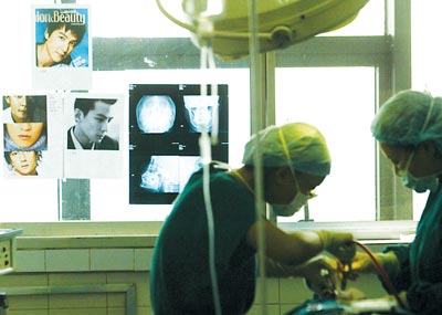 昨日,某醫(yī)院,香港明星吳彥祖的海報貼在窗戶上,醫(yī)生正為王先生做手術記者 鄒飛 攝“顴骨千萬不要凹陷!盡可能讓臉窄!”昨日,本市某醫(yī)院整形科,一名高大、帥氣的男子持4張香港明星吳彥祖的海報,要求整成吳彥祖的樣子。據(jù)整形科吳主任介紹,本月已有兩個帥哥來醫(yī)院要求整成吳彥祖。