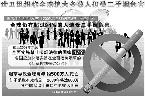 2008年10月30日,來自全國的400家環(huán)保民間組織的代表在北京發(fā)出共同聲音:吸煙是污染環(huán)境的行為,應(yīng)當(dāng)維護(hù)被動吸煙者、維護(hù)環(huán)境的合法權(quán)益。他們呼吁盡快制定并頒布控?zé)熖貏e是公共場所禁煙的法律、法規(guī),并有效監(jiān)督實施。根據(jù)中華環(huán)保聯(lián)合會《被動吸煙的調(diào)查問卷報告》,85%的受調(diào)查公眾不清楚被動吸煙對人體健康造成危害的嚴(yán)重性。而目前,我國的吸煙人數(shù)達(dá)到3.5億,被動吸煙人數(shù)高達(dá)5.4億。我國于2003年11月10日簽署了世界衛(wèi)生組織的《煙草控制框架公約》,2006年1月9日,該《公約》在我國生效。