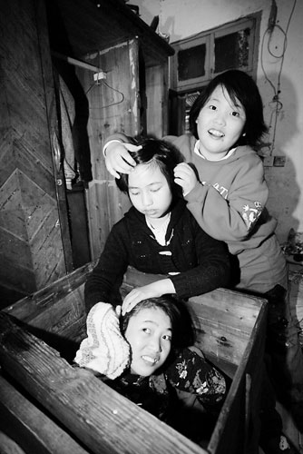 正對著門是一個長一米、寬半米、高約90厘米的木頭箱子,曾之的姐姐竟然就坐在箱子里!“姐姐站不起來,如果在床上或者別的地方就會亂爬,還會揀地上的臟東西吃,實在沒辦法只能讓她坐在這里面!痹呎f邊幫姐姐理了理頭發(fā),與姐姐相比,曾之明顯瘦弱許多,臉色也比姐姐黃。