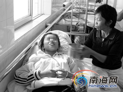 11月17日下午,記者在海南省農墾總局醫(yī)院神經(jīng)內科病房看到,阿霞的媽媽、姨媽和同學都在一旁照顧阿霞。阿霞目光呆滯,嘴里不時地喃喃自語說:“我好奇心強,我要找知音陪我去逛街,我有好多話要說,我想找回我的記憶……”阿霞的媽媽和同學告訴記者,阿霞讀書很刻苦,成績都排在前幾位,她一直向往重點高中,還夢想著考上重點大學,考試總想要考第一。
