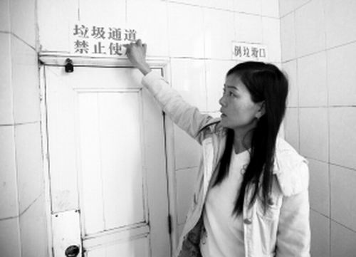 在李嬌的指引下,記者來(lái)到事發(fā)現(xiàn)場(chǎng),此時(shí),“肇事”的垃圾通道門上已經(jīng)重新上了鎖,并掛上“垃圾通道禁止使用”的警示標(biāo)語(yǔ)!斑@是出事后醫(yī)院設(shè)置的!崩顙沙鍪玖耸掳l(fā)當(dāng)時(shí)拍下的照片,“醫(yī)院的做法實(shí)則已經(jīng)承認(rèn)過錯(cuò),但就是不肯和我們協(xié)商賠償!