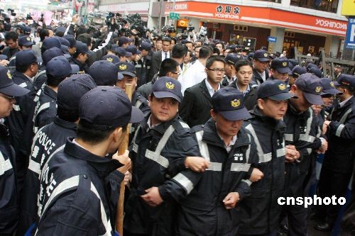陳水扁從其辦公室步行前往不足百米遠(yuǎn)的特偵組,眾多警察在其周圍維持秩序,現(xiàn)場附近警方部署大批警力。中新社發(fā) 黃少華 攝