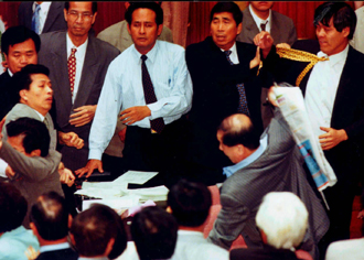 1999年6月15日,“立法院”成了“暴力院”,一整天議事氣氛火爆,從下午到晚間,暴力打人事件頻傳,晚間八點(diǎn)多甚至演出集體暴力場面。無黨籍“立委”羅福助因為不滿民進(jìn)黨杯葛議事,與民進(jìn)黨“立委”發(fā)生沖突而扭打,一時間包括羅福助兒子羅明才等數(shù)人都加入戰(zhàn)局,現(xiàn)場打成一團(tuán),朝野“立委”多人掛彩。這場暴力打人過程長達(dá)十余分鐘,過程令人怵目驚心。