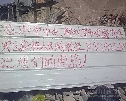 據(jù)當?shù)孛襟w報道,救援隊員不顧疲勞,盡全力救人,餓了干吃方便面,累了就靠著廢墟休息。面對來自全國各地救援隊的忘我援助,玉樹州一職業(yè)技術(shù)學校的學生書寫標語:感謝黨中央、解放軍和武警官兵,災(zāi)區(qū)藏族人民的救星,我們永遠銘記您們的恩情。