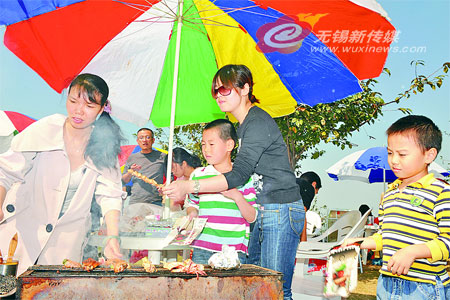 10月12日,在無錫濱湖區(qū)一個“農(nóng)家樂”旅游點(diǎn),來這里休閑的人們與孩子一起燒烤。近幾年來,我市依托資源優(yōu)勢,大力發(fā)展生態(tài)觀光旅游業(yè),推出“農(nóng)家樂”等一些品牌景點(diǎn)和項(xiàng)目,吸引了眾多游客和城區(qū)市民度假休閑,既豐富了旅游內(nèi)容,又增加了當(dāng)?shù)剞r(nóng)民收入。