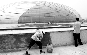 游人用手機拍攝建設中的國家大劇院。