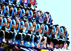 11時(shí)11分11秒,其余10位“脫光”失敗的勇士慘了,他們一同坐到了過(guò)山車的第一排,而且都光著膀子!隨著呼嘯的風(fēng)聲,10名未能“脫光”的勇士們被“明明”們?nèi)拥搅撕L(fēng)中……