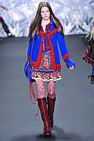 不愿意把沉悶帶進秋冬的設(shè)計師大有人在。彩虹般的印花圖案、鮮活的色彩組合還有新藝術(shù)式的刺繡,更別提軋花皮革的靴子、天鵝絨花朵的頭飾、串珠項鏈和佩里斯紋緊身衣……今年秋冬的設(shè)計Anna Sui相對其歷次的發(fā)布,算是最華麗繁復的。對于Anna Sui粉絲來說,這種將具有不同歷史性的藝術(shù)風格大膽混融的手法,相較于前幾季,則顯得較孤芳自賞,像是如虹光般的印花、或是熱情活潑的配色處理,以及一些刺繡花紋和手工雕刻過的靴款、天鵝絨印花帽飾、串珠項鏈、迷幻的渦紋花呢緊身上衣…等等,盡管花俏,卻也成為Anna Sui2008秋冬系列的一大特色。