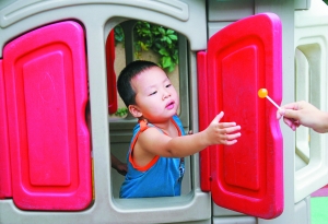 錛錛是小區(qū)里最受歡迎的寶寶之一,因為他見誰都瞇著眼睛笑,不逗時微笑,一逗就大笑。右:錛錛對棒棒糖的喜愛不亞于肉類,看在棒棒糖的份上,相當配合記者叔叔阿姨。