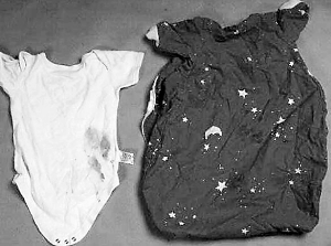 法庭展示的Baby P曾經(jīng)穿過(guò)的衣服,上面沾滿血跡。