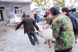 映秀鎮(zhèn)活動(dòng)板房的居民忙著熬豬油,百公里外的汶川蘿卜寨,村民們正忙著殺年豬呢。昨天早上9點(diǎn),記者剛走進(jìn)村子,就聽到豬的嚎叫,五個(gè)年輕的男子有的逮豬耳朵,有的揪豬皮,還有個(gè)抓尾巴,使出全身力氣,想讓豬乖乖就范,可那頭豬很有點(diǎn)莽勁,哇哇慘叫著直往外奔,“按住!按!”豬主人袁慶彬拿著一把長刀跟著攆,還一邊指揮大家用力把豬按在長板凳上,五個(gè)人使出全身力氣按住,袁慶彬瞅準(zhǔn)時(shí)機(jī)對(duì)準(zhǔn)豬的喉嚨,一刀下去,一會(huì)兒血就流滿了一大盆。此時(shí)氣溫接近0℃,可他的背心居然浸出了汗,拿了一張干毛巾使勁擦。