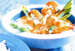 這是一道泰式風(fēng)情料理,是選用新鮮菠蘿肉和大蝦,與泰國(guó)黃咖喱和清水一同烹煮,加入椰漿調(diào)味即成。先將菠蘿去皮洗凈,果肉切成塊狀,再將胡蘿卜、紅椒切成丁,青豆放入沸水中焯一下?lián)破饌溆;蝦剪去尖刺和蝦須洗凈,吸干水分,灑上香炸粉;將蝦放入油鍋中大火炸2分鐘撈起;再炒香蒜末、蔥末、胡蘿卜丁和青豆,倒入咖喱醬料包,注入1碗清水?dāng)噭蛑蠓;加入白糖和雞粉調(diào)味,倒入紅椒丁和炸好的對(duì)蝦翻炒均勻,最后倒入菠蘿塊拌炒均勻,即可。