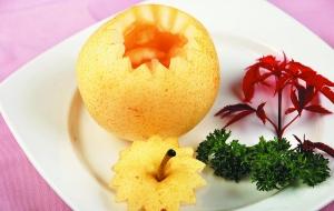 2. 梨洗凈削皮,從蒂部往下1/3處打橫切開(kāi)做蓋(有心思的話可切成鋸齒狀),挖去內(nèi)核;
