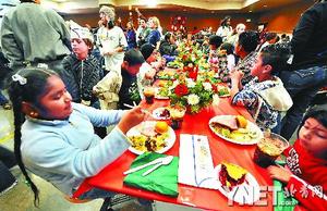 12月24日,圣誕節(jié)前夕,在美國加利福尼亞州洛杉磯市一慈善機構(gòu)內(nèi),數(shù)千名兒童享用著該機構(gòu)提供的圣誕大餐