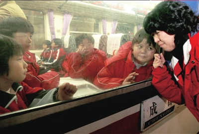 昨天下午,60多名震后在北京上學(xué)的青川小學(xué)生,坐大巴一路唱著歌來到車站,一提起回家就興奮不已。孩子們身著統(tǒng)一的服裝、手拎著大包。下午4點(diǎn)40分,火車即將出站,同學(xué)們?cè)九d奮的臉上掛著淚珠,靠近站臺(tái)的車窗前擠滿了小腦袋,他們不斷拍打窗戶和老師告別。