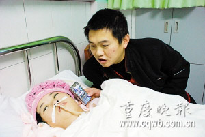 “小豬兒,來,聽聽歌曲。”昨日上午11時,巴南區(qū)人民醫(yī)院神經(jīng)外科病房,42歲的趙江用手機播放著“你問我愛你有多深”。病床上,女友朱永萍眼睛似閉非閉,毫無反應。