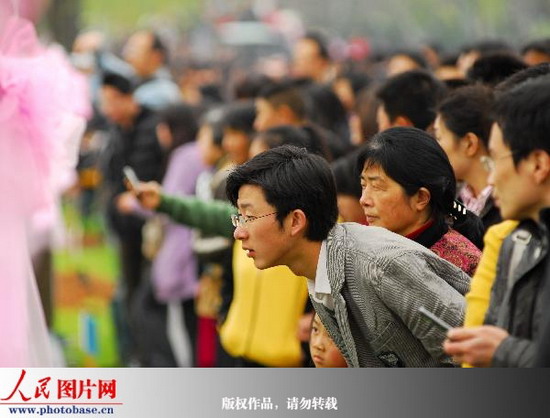 2009年3月29日,中國(guó)國(guó)內(nèi)史上規(guī)模最大的相親會(huì)在杭州西湖白堤上舉行。約8萬(wàn)名來(lái)自全國(guó)各地的未婚男女及其父母親友等進(jìn)入近2公里長(zhǎng)的相親大會(huì)現(xiàn)場(chǎng),在萬(wàn)人相親快樂(lè)牽手、“我要相親”真情告白、公益紅娘“緣”搜索、八分鐘愛(ài)情速配、愛(ài)情大沖關(guān)、“比武”招親等活動(dòng)環(huán)節(jié)中找尋自己魂?duì)繅?mèng)縈的另一半。(蘇斌)