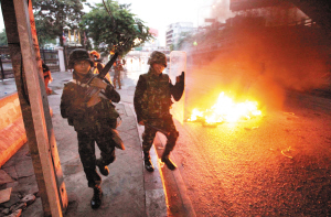 在泰國總理阿披實(shí)12日宣布曼谷和周邊5府部分地區(qū)進(jìn)入緊急狀態(tài)后,泰國軍隊(duì)和警察開始在重要路段部署兵力。13日凌晨4時(shí)30分,數(shù)百名士兵在丁當(dāng)?shù)貐^(qū)采取的驅(qū)散行動(dòng)中與示威者發(fā)生嚴(yán)重沖突。阿披實(shí)說,約70人在沖突中受傷,其中23人為士兵,大部分為催淚彈所傷,無人喪生。
