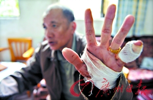 除了手被砍傷以外,洪叔的腰部也被劃傷,走路時一瘸一拐。回憶前晚發(fā)生的事情,洪叔和美姨都很后怕。洪叔說,當(dāng)晚8點50分,美姨到洗手間沖涼,廳里只剩下他一人。十分鐘后,洪叔突然看到兩個身影閃進院內(nèi),還沒有等他反應(yīng)過來,一名男子捂住他的嘴巴,拿著西瓜刀說,“不要動,再動就捅死你!”另外一名男子則在屋內(nèi)到處翻找,洪叔拼命地掙扎反抗。