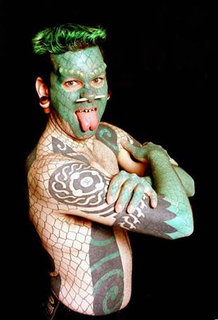 埃里克·斯普拉格,人稱“蜥蜴人”,生于1972年,是“分割舌頭”整容術(shù)的創(chuàng)始人,這種手術(shù)曾一度成為流行趨勢。為了讓自己看起來更像爬行動物,這名37歲的男子已經(jīng)在紋身沙龍里度過了700小時。除此之外,他還在眉毛上方植入了10個特氟龍材料的“角”,并讓牙齒變得更加鋒利……