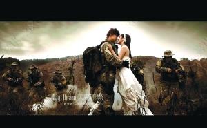 灰暗的天空下,身穿潔白婚紗的新娘與新郎緊緊相擁,但他們倆身后卻是硝煙彌漫的戰(zhàn)場,戰(zhàn)士們?nèi)蔽溲b、手持沖鋒槍,表情嚴(yán)肅地往前沖。戰(zhàn)爭婚照,只有80后敢把戰(zhàn)爭、血腥、悲劇和婚紗聯(lián)系在一起。80后生長在網(wǎng)絡(luò)信息時代,他們總能從網(wǎng)上獲取最新的信息,從而向攝影師提出各種各樣的要求!八晕覀円惨粩鄤(chuàng)新,緊跟著潮流走,才能滿足消費者的需求!苯裆屑s的經(jīng)理王軍告訴記者。