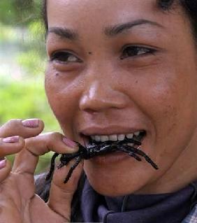 現(xiàn)在柬埔寨人用毒蜘蛛作佳肴宴請客人是常事了。去年記者到一處深山農(nóng)場采訪。農(nóng)場主人特地吩咐做油炸毒蜘蛛。為了不辜負(fù)主人盛情,我壯膽拿起蜘蛛,蘸著椒鹽、檸檬汁吃進(jìn)嘴里,味道還不錯,有點像油炸蠶蛹的味道,F(xiàn)在來金邊的旅游者,不少人特地到街頭的市場上品嘗這種“蜘蛛小吃”。當(dāng)?shù)剞r(nóng)民也因此多了一條生財?shù)穆纷印?